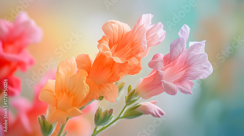 Fototapeta premium Soft focus pastel pink and orange snapdragon flowers bloom gently in a sunlit garden with a dreamy bokeh background