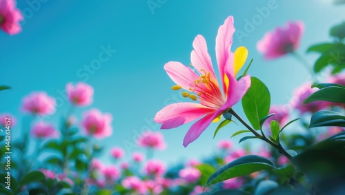 Fototapeta premium Soft-focus pink blossoms against a bright blue sky in a garden scene