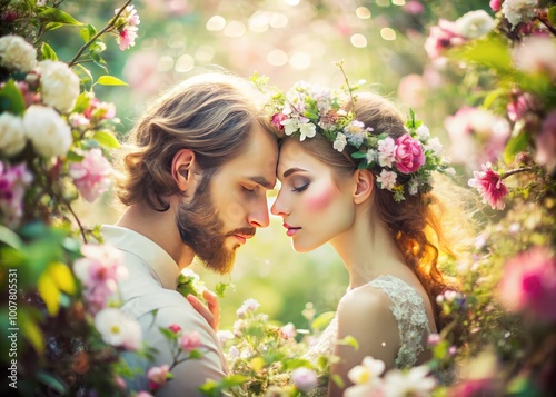 Obraz premium Soft focus portrait of intertwined lovers surrounded by blooming flowers and...