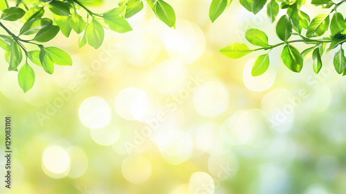 Fototapeta premium Soft-focus spring nature background with white blossoms, green leaves, and golden sunlight bokeh, creating a dreamy seasonal atmosphere perfect for floral themes, wedding invitations, spa designs