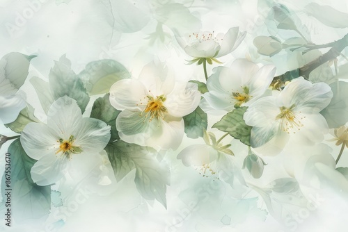 © Bipul Kumar, Obraz premium Soft Focus White Flowers with Green Leaves on a Blurred Background