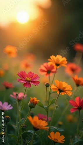 Fototapeta premium Soft focus wildflowers bathed in warm sunset light, gentle breeze ,...