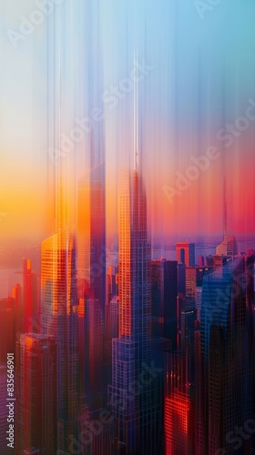 © Absent Satu, Fototapeta premium Soft-focused city skyline in blue and pink hues at dusk, capturing an abstract beauty. Abstract depiction of a city skyline.