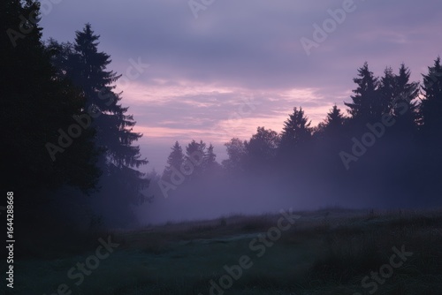© Photo Hub, Fototapeta premium Soft fog rising from quiet forest clearing at dawn.