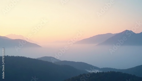 Obraz premium Soft foggy morning landscape with gradient gray background and silvery hues,...