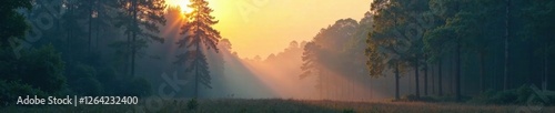 © Prayoon, Naklejka premium Soft glow illuminates a misty forest with trees in the distance, blurred and indistinct , forest, mysterious, natural