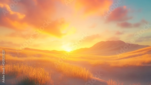 © Thirakun, Obraz premium Soft golden dunes illuminated by the warm hues of a setting sun
