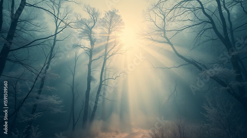 © Chanasorn, Obraz premium Soft golden sunlight diffusing through the mist in a barren winter forest creating a serene and magical morning moment