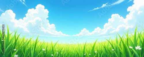 © Jiampoj, Obraz premium Soft grass sways gently in a light sea breeze under a vibrant blue sky dotted with wispy clouds , white, clouds