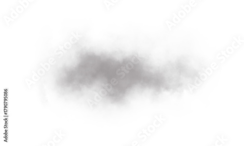 Fototapeta premium Soft gray smoke cloud texture isolated on white background, light mist or fog effect for digital design, airy dust and vapor overlay, abstract atmospheric illustration element.