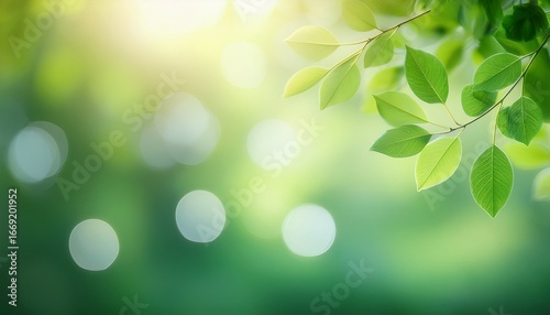 © Mikael, Fototapeta premium soft green blur of nature with light ethereal bokeh effect leafy branches in the upper left creating a calming background atmosphere
