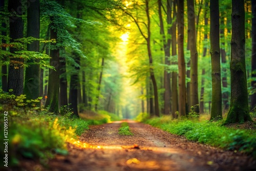 © Manatsavee, Obraz premium Soft Green & Brown Blurred Forest Path Background for Website Design