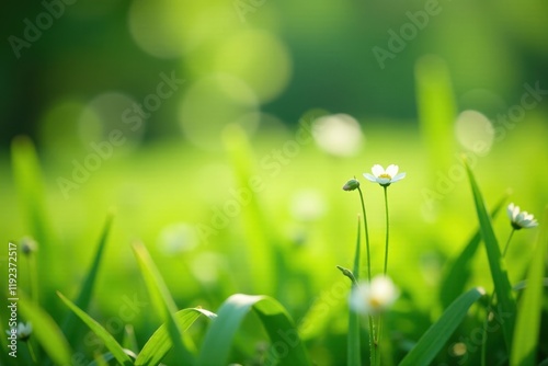 © dadtophoto, Fototapeta premium Soft green meadow, out-of-focus wildflowers, highlighted grass blade, flora, spring, environment