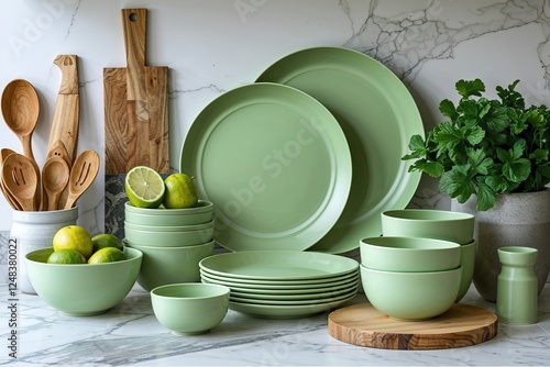 © Michael, Fototapeta premium Soft Green Melamine Dinnerware Stylishly Enhances Kitchen Decor and Organization