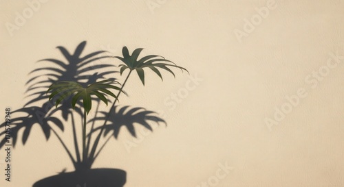 Naklejka premium Soft Green Plant Shadow on Smooth Beige Wall with Warm Natural Light and...