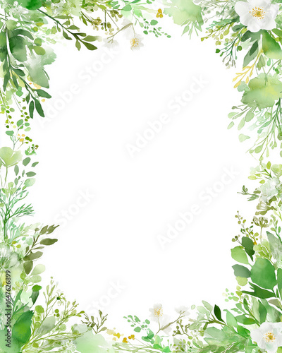 © Ming Yi, Naklejka premium Soft Green Watercolor Floral Border on Light Background