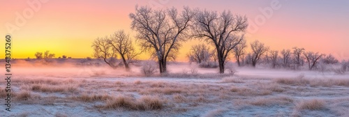 © Blackmint Studio, Obraz premium Soft hues of dawn fill the sky as frost clings to bare trees in a tranquil landscape. Mist hangs over the grass, creating an ethereal atmosphere in early morning light