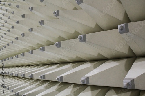 Obraz premium Soft hybrid pyramidal microwave and radio frequency absorbers close up. Electromagnetic compatibility measurements absorbers in anechoic chamber with soundproof walls for scientific experiments