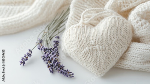 Fototapeta premium Soft Knitted Heart with Lavender Flowers Aromatic Sachet on White Background Elegant Home Decor and Relaxation Concept
