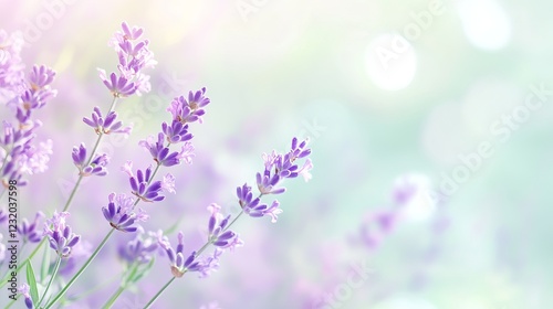 Fototapeta premium Soft lavender blooms blend into a pale green background creating a tranquil...