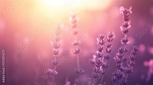 © AizayStock, Fototapeta premium Soft Lavender Blooms in a Warm Sunset Glow Over a Serene Meadow