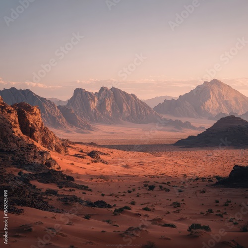 Naklejka premium Soft light bathes a vast, sandy desert landscape, punctuated by rocky,...