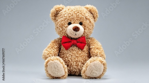 Fototapeta premium Soft, light brown teddy bear with a red bow tie sitting against a plain backdrop