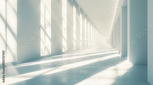 Fototapeta premium Soft light filters through tall windows, creating a serene atmosphere in a spacious hallway with minimalistic design, unfocused image