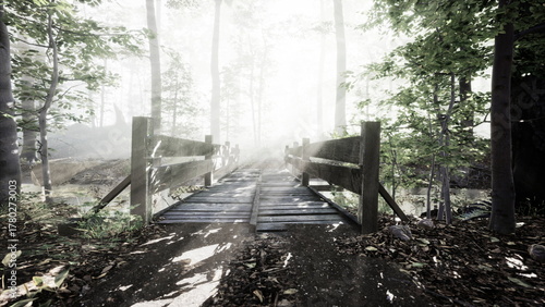 Naklejka premium Soft light filters through the trees as mist lingers in the air, revealing a charming wooden bridge. Natures tranquility invites exploration of this beautiful forest path.