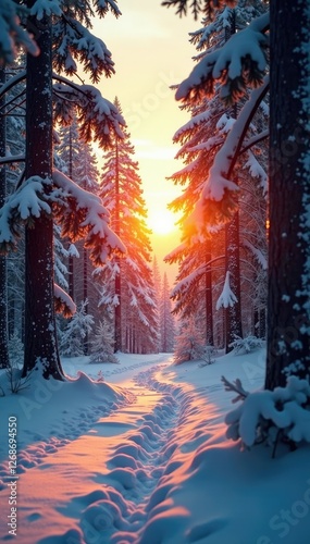 Naklejka premium Soft light of winter sunrise illuminates snow-covered pines, Light, Sunrise,...