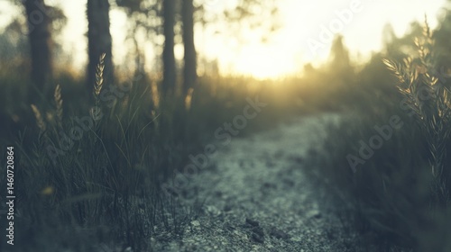 Fototapeta premium Soft light shines through tall trees as a winding path leads into the...