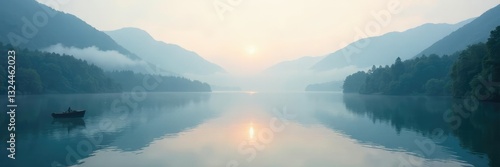 © Kingphet, Fototapeta premium Soft light spreads across the lake's surface calm, water reflection, misty mountains, tranquil atmosphere