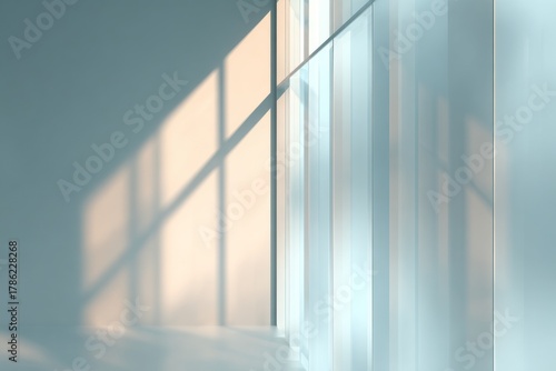 Fototapeta premium Soft light streaming through large windows creates gentle shadows on a serene interior wall