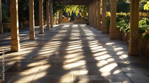 © Natchooda, Obraz premium Soft morning sun streams through a pergola, creating long, dramatic shadows across the tiles on the ground.