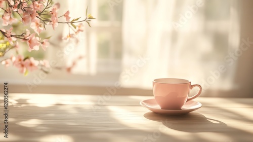 Fototapeta premium Soft Morning Sunlight Illuminates a Pink Cup Beside Delicate Pink Blossoms on...