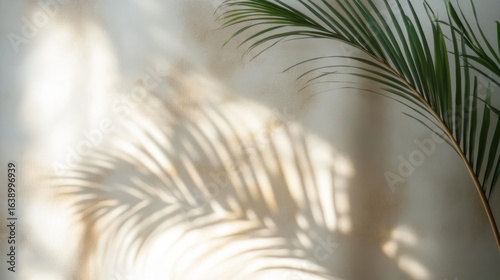 Obraz premium soft natural light casting a large palm leaf shadow on a textured beige wall with a real palm leaf branch extending from the right side