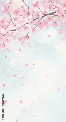 © Ura, Fototapeta premium Soft pastel background with delicate pink sakura cherry blossom branches floating gently in a bright dreamy sky