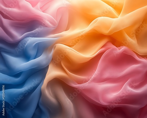 © fgdr, Obraz premium Soft pastel chiffon fabric in blue, orange, and pink hues.
