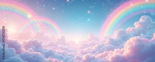 Naklejka premium Soft pastel clouds drift under a bright sky with double rainbows and twinkling stars. Dreamy, ethereal, magical sky scene creates a whimsical atmosphere perfect for fantasy themes and children.