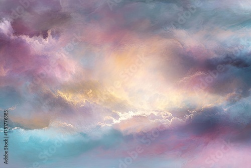 Obraz premium Soft, pastel-colored cloudscapes. A mix of pinks, purples, yellows, and blues. A diffused light source illuminates the clouds