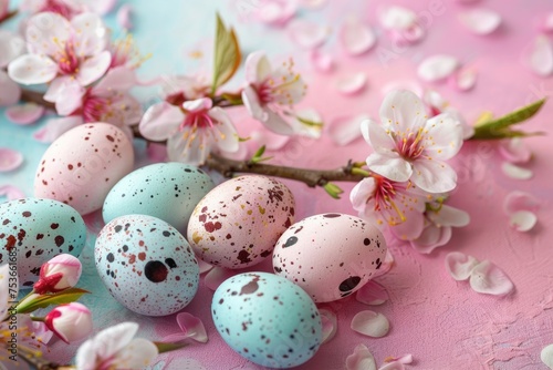 Fototapeta premium Soft pastel colored Easter eggs nestled among cherry blossoms representing...