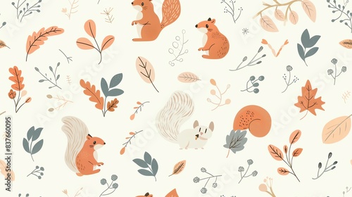 © Pojjanee, Naklejka premium Soft pastel-colored seamless pattern with hand-drawn leaves, small flowers, and squirrels, showcasing a harmonious and whimsical design