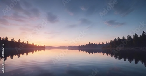 © Patthama, Fototapeta premium Soft pastel colors blending with darkening blue sky during sunrise on a peaceful lake background, serene, lake