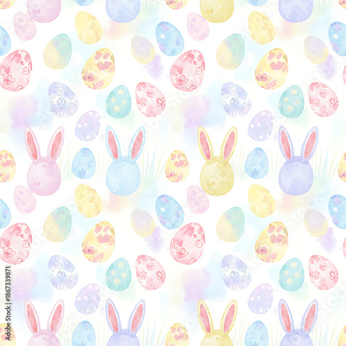Obraz premium Soft Pastel Easter Eggs and Bunny Ears Seamless Pattern Background. Gentle...