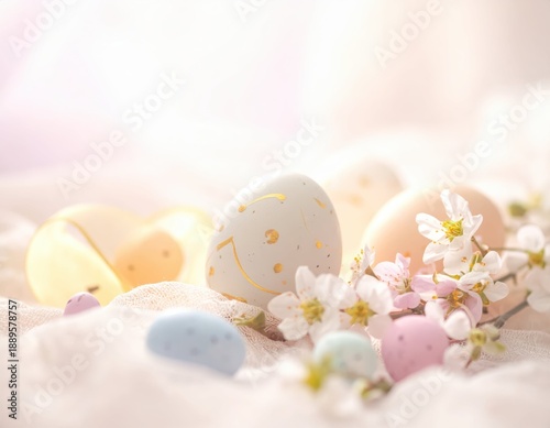 Fototapeta premium Soft Pastel Easter Eggs and Delicate Flowers on a Light Background