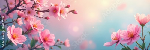 Fototapeta premium Soft pastel hues with blooming flowers and leaves, botanical, floral