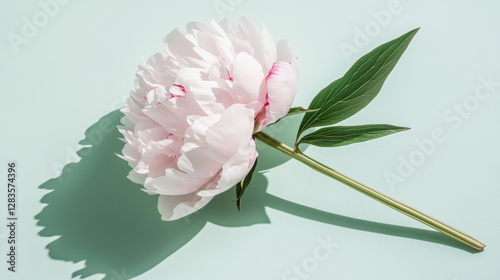 Fototapeta premium Soft pastel pink peony flower with lush petals and green leaves on a mint background, casting a natural shadow, ideal for beauty, weddings, nature, and floral art