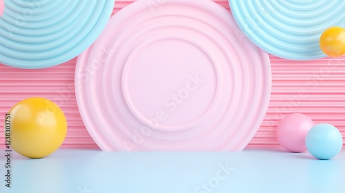 Obraz premium Soft Pastel Plates and Colorful Spheres on a Striped Background for Creative...
