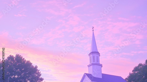 © Jakkarin, Fototapeta premium Soft Pastel Sky Behind White Steeple at Dusk with Gentle Clouds