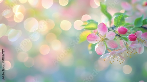 Fototapeta premium Soft pastel spring scene with abstract light bokeh effect in the background creating a dreamy blur of vibrant blossoms and greenery